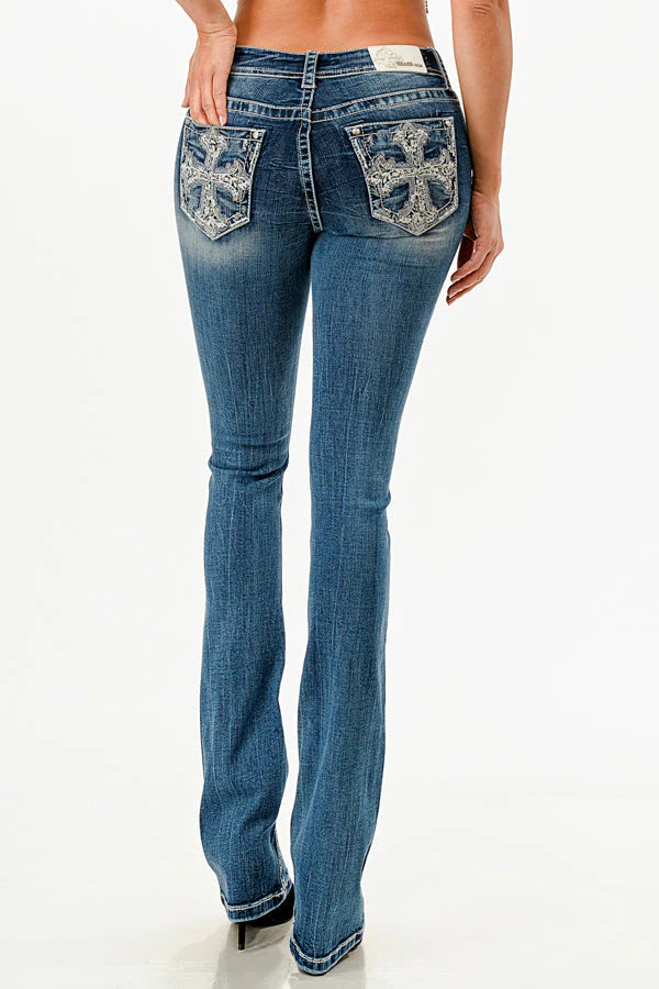 Butterfly Embroidery LT Blue Mid Rise Bootcut Embroidered Jeans