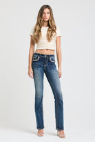The Grace in LA women's bootcut jean in Easy Fit shows off your best shape by featuring a higher rise. The denim fabric features a softer and higher stretch for exceptional comfort all while maintaining a denim look. The mid-rise creates a form-flattering fit for every curve. The jean is detailed with an Aztec embroidered design on the back pockets natural hand-sanding, and whiskering. They look like they’ve been yours forever.
