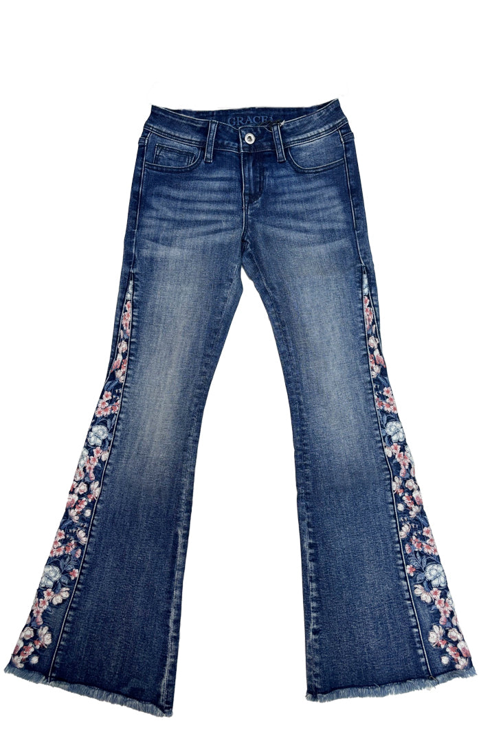 The Grace in LA girls and little girls' jeans come in different fits, we have bootcut, skinny, flare. The jeans are unique detailed with embroidery, western stich, and accent sequins. All natural washes with natural hand sanding and whickering. These jeans make every girl and little girl feel special and comfortable.